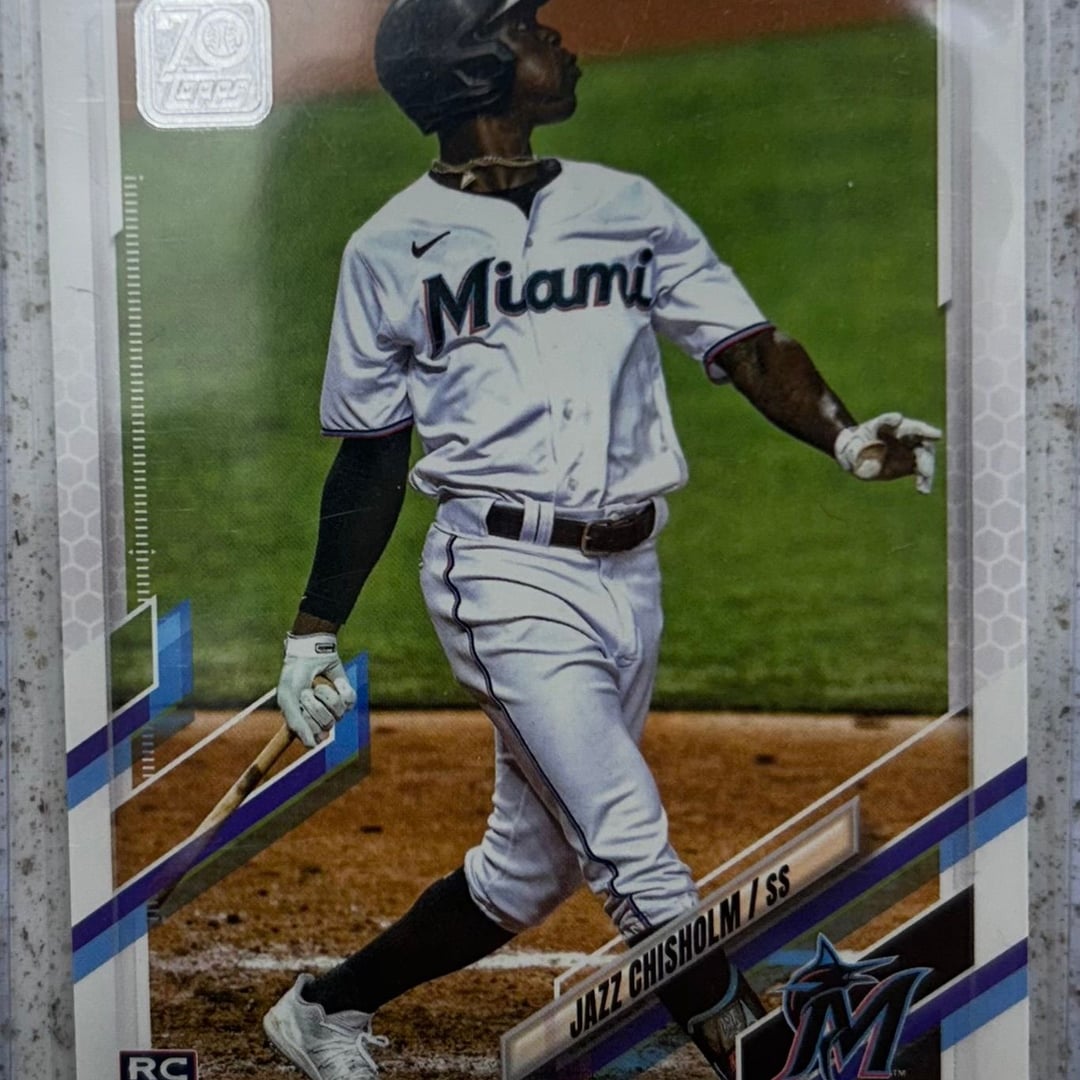 Own a piece of baseball history with this 2021 Topps Series 2 Jazz Chisholm Jr. Rookie Card (#538). This highly sought-after card features the dynamic Miami Marlins shortstop, Jazz Chisholm Jr., a young star known for his exciting play and charismatic personality. It's an essential addition for any baseball card collector or Marlins fan. The card is in excellent, pack-fresh condition and has been well-preserved.