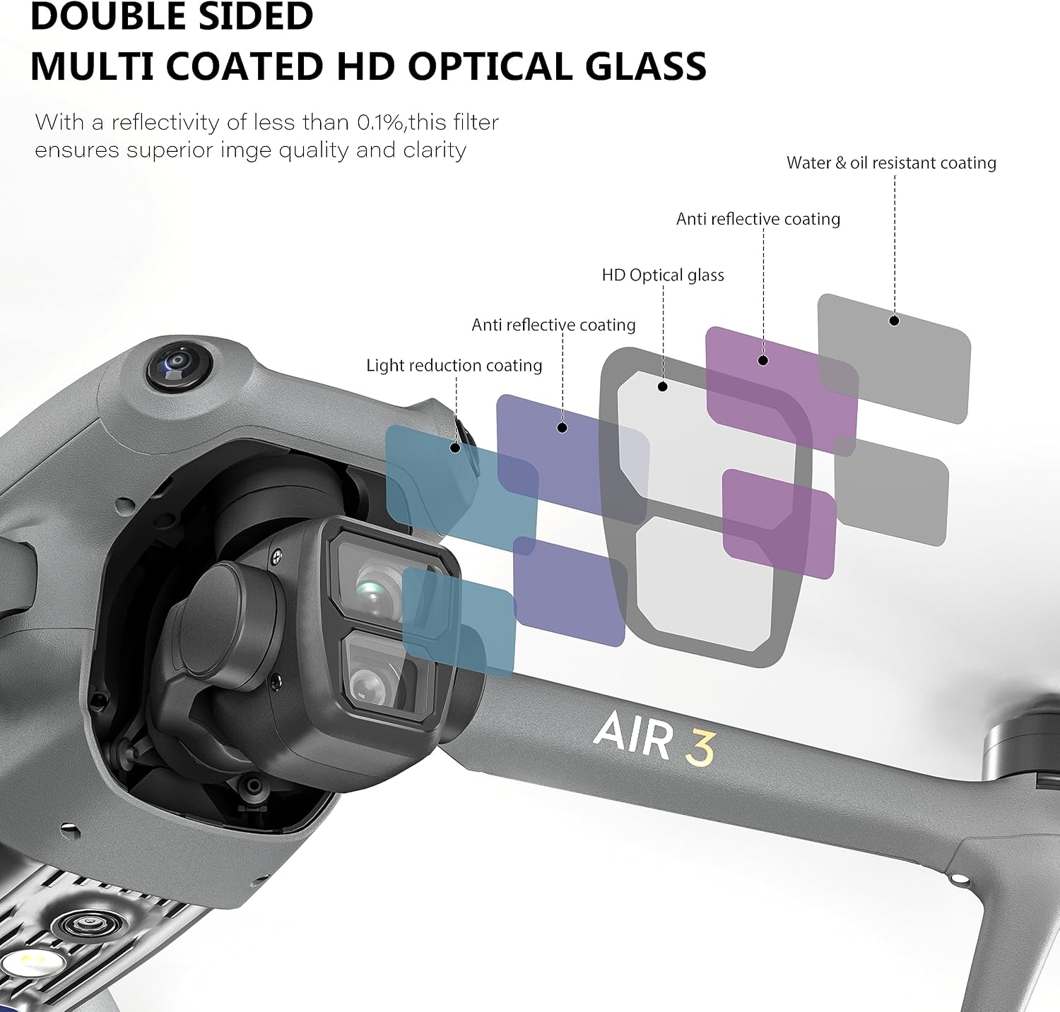 • 【Multi-layer Optical Coating】Air 3 filter set double-sided, multi-layer nano-coating process can reduce glare and protect for DJI air 3 lens, ensuring accurate color reproduction.