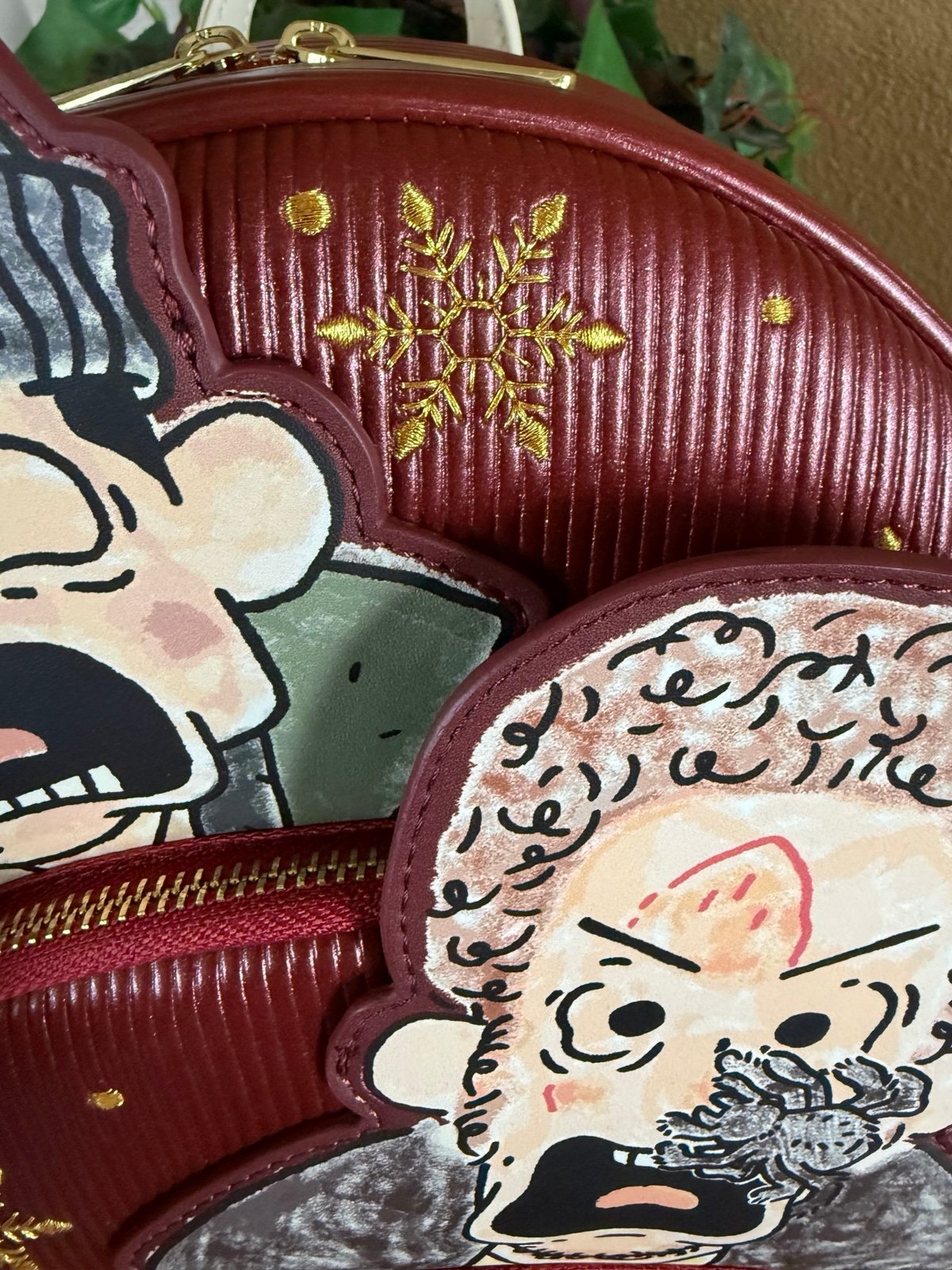Time to celebrate a holiday classic in style! This NEW WITH TAGS triple pocket Loungefly mini backpack features Kevin, Harry, and Marv – each on their own pocket. You'll find metallic embroidered snowflakes on the exterior. The rest of the bag features shiny red faux corduroy. One of the side pockets says, "Merry Christmas, Ya Filthy Animal." This is a fun accessory to carry along through the holiday season and show off one of your favorite holiday movies! Features sturdy top handle, padded adjustable shoulder straps, appliqué, embroidered, faux corduroy & printed details, molded metal zipper charm, coordinated interior lining with slip pocket and Home Alone X Loungefly enamel brand plate!