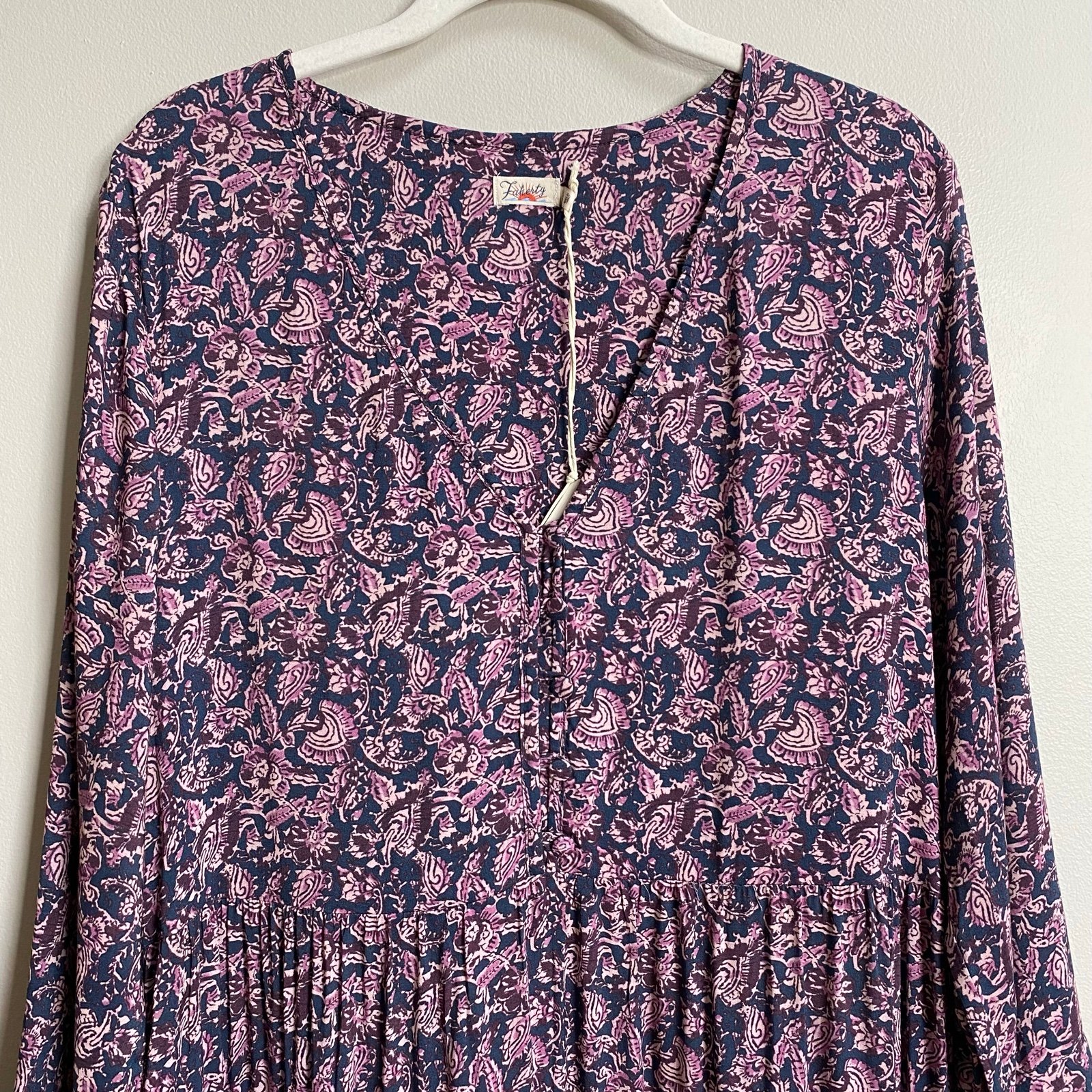 Rich hues color this wear-everywhere dress done in a roomy fit and finished with a wide ruffle at the hem. Allover floral print. V-neck. Button front bust. Long sleeves. Side pockets. Tiered skirt. Shirring details. Lightweight, flowy woven fabrication. Unlined.