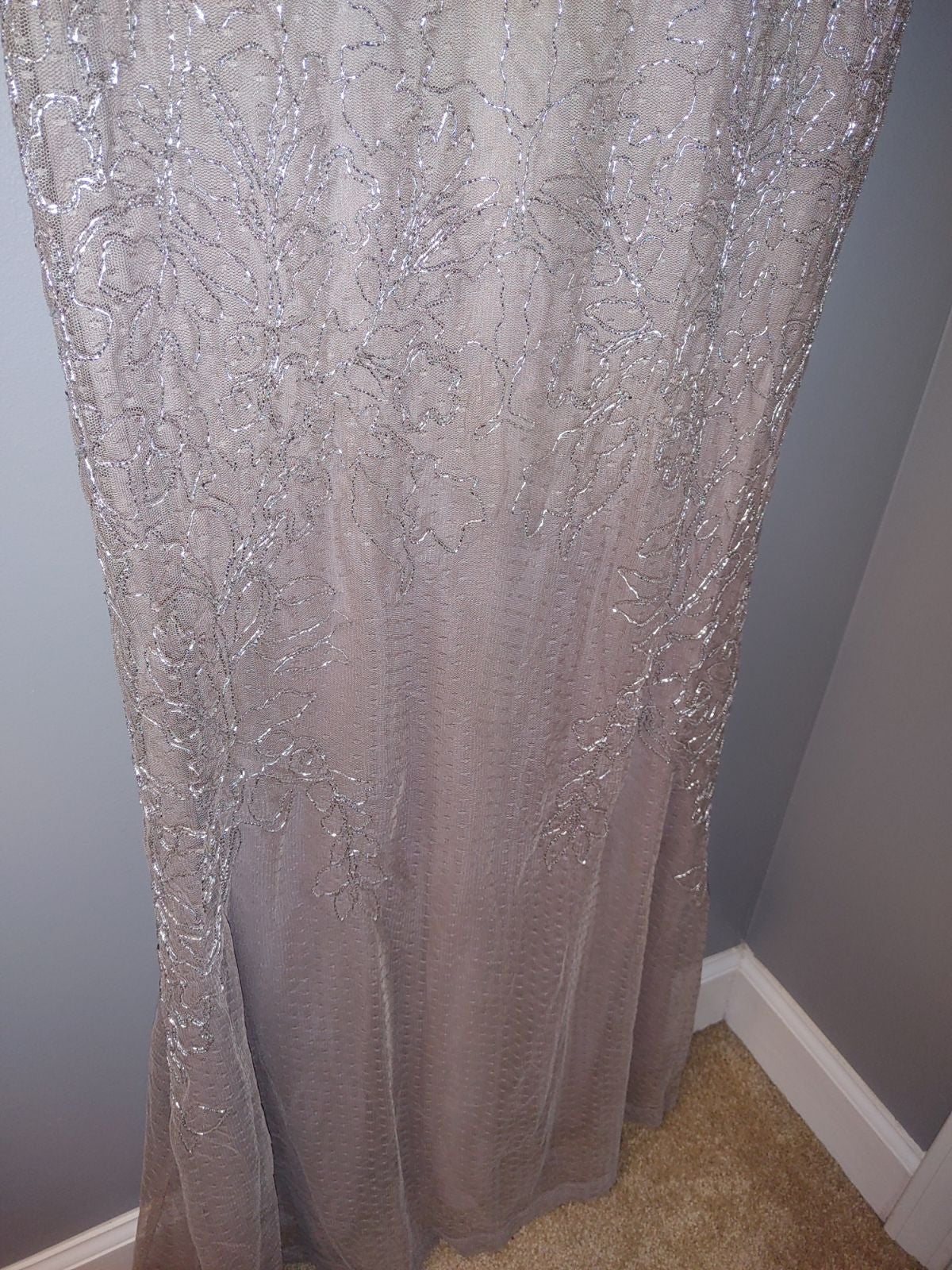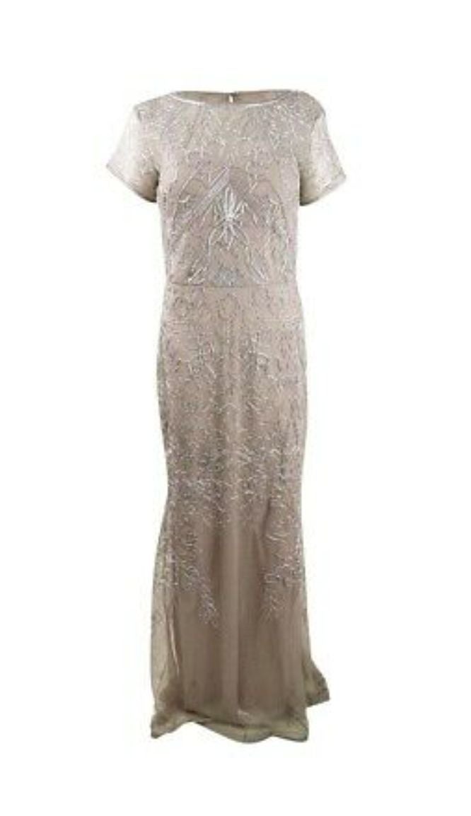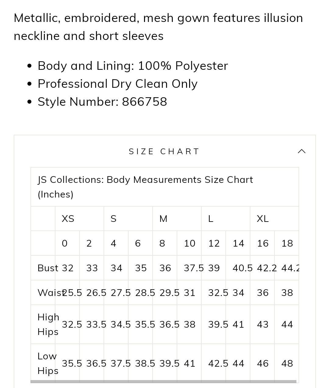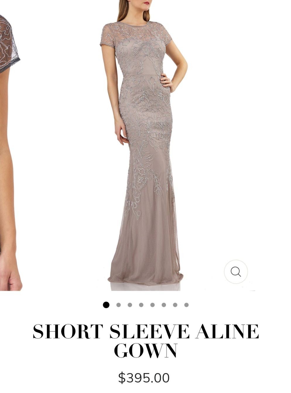 Metallic, embroidered, mesh gown features illusion neckline and short sleeves