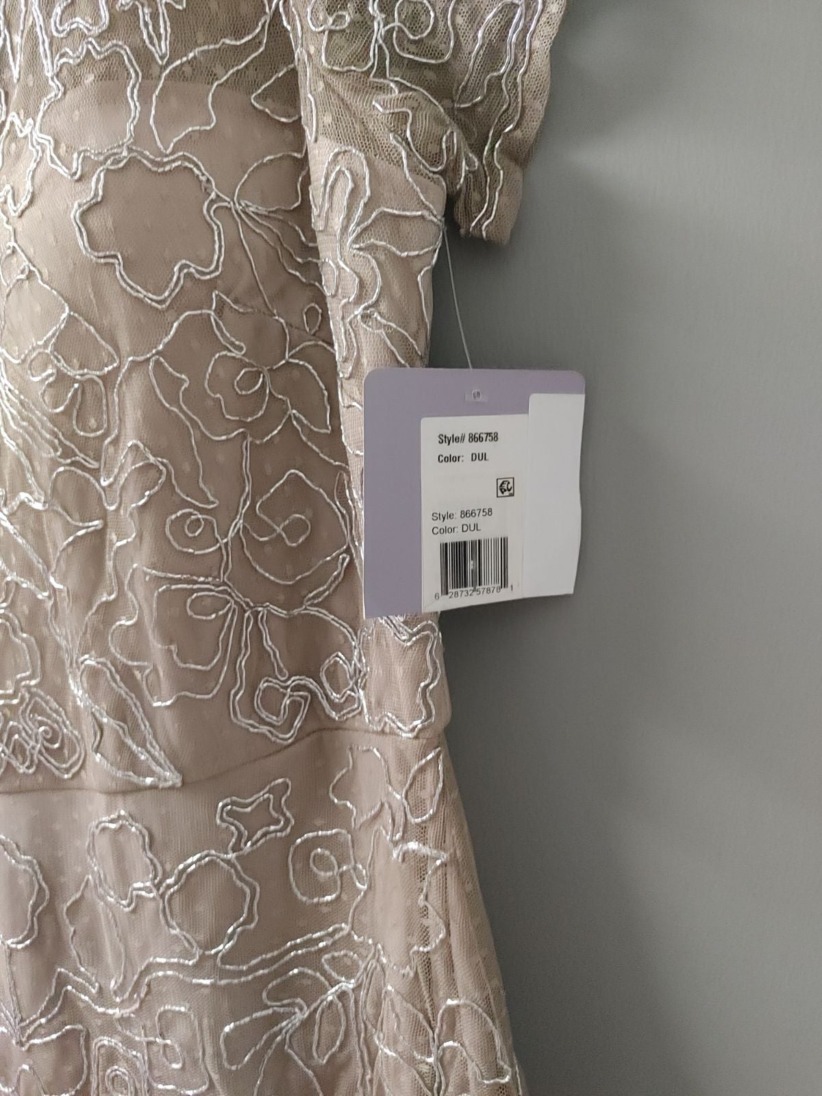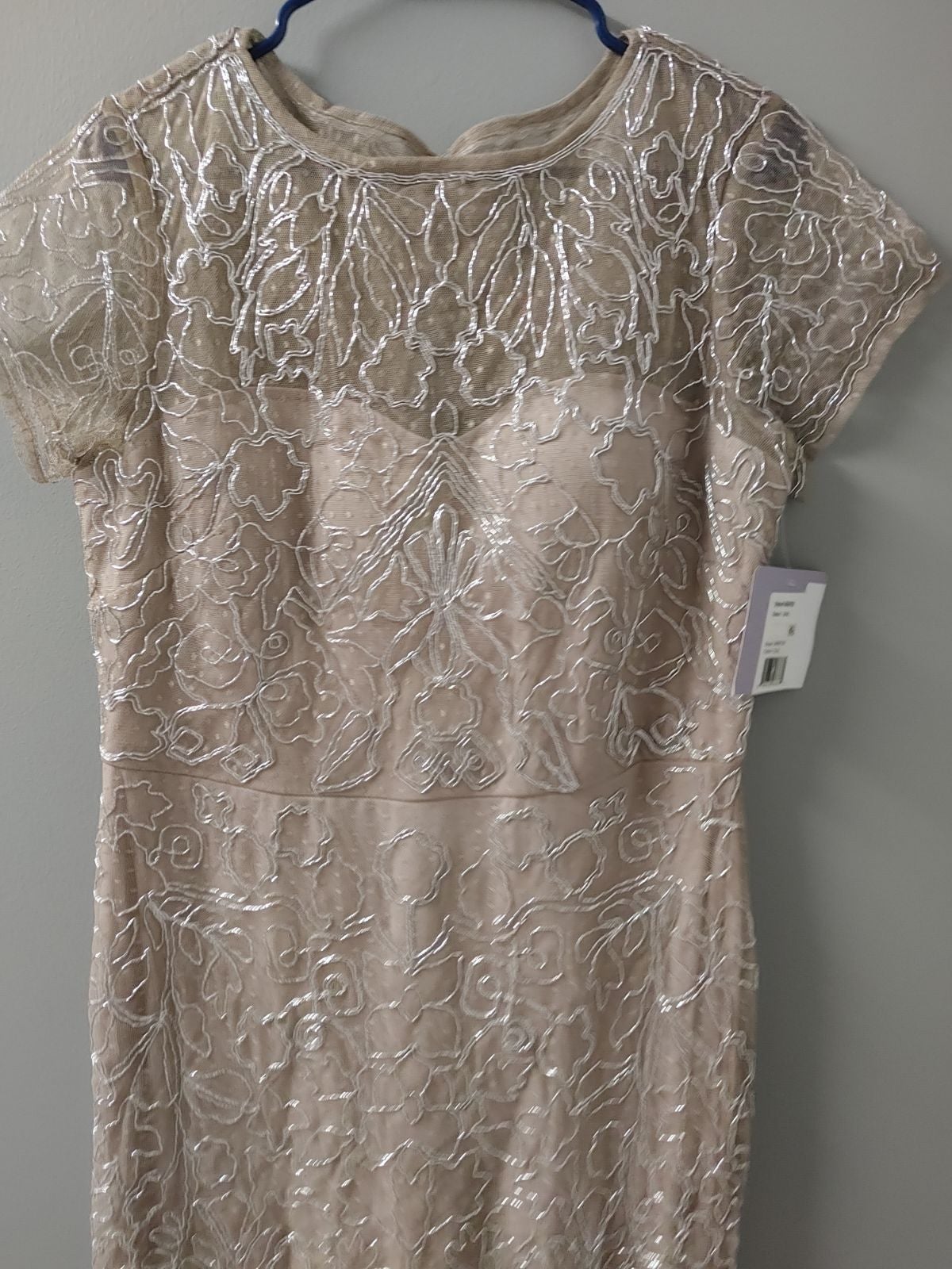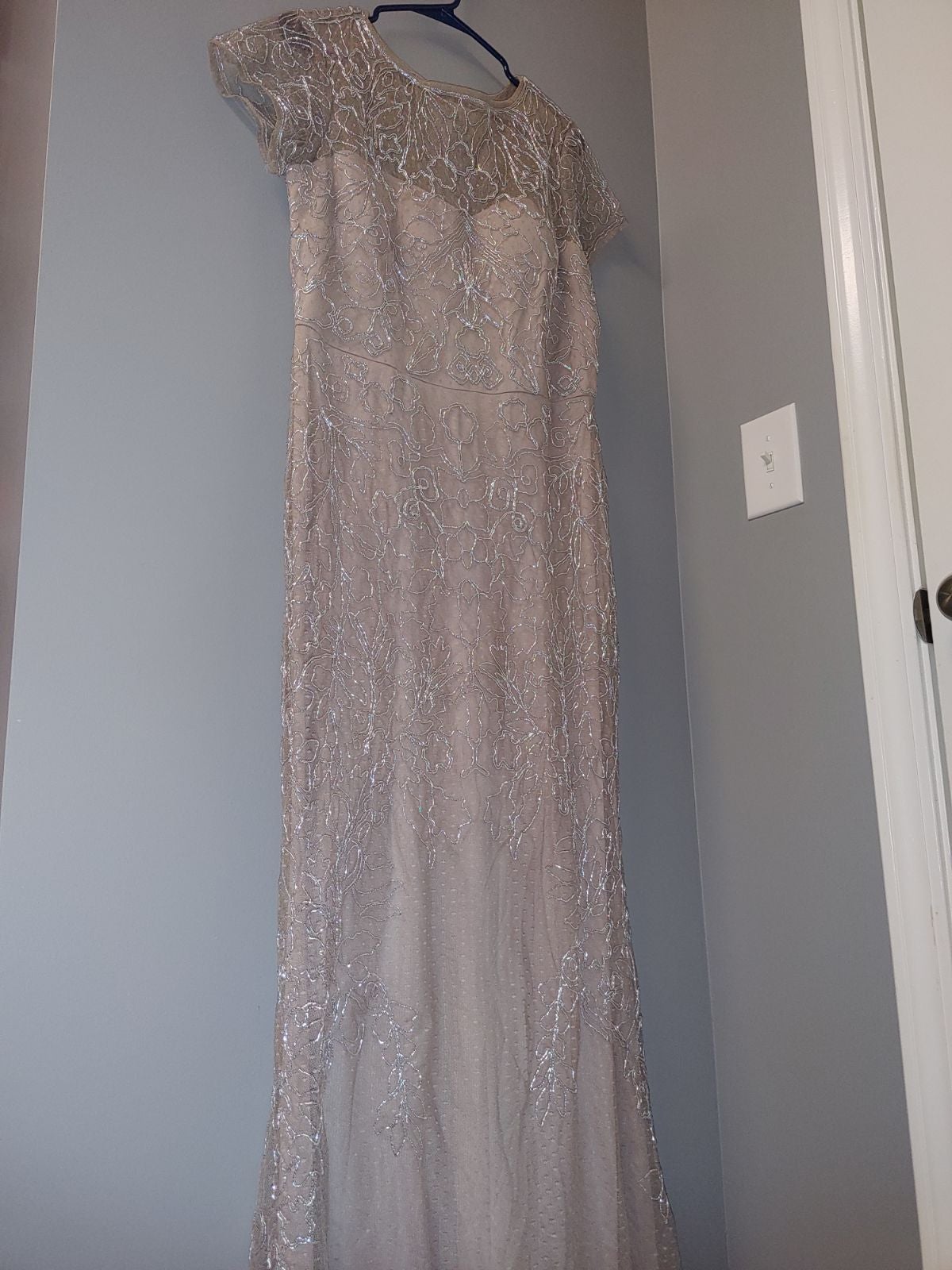 Metallic, embroidered, mesh gown features illusion neckline and short sleeves