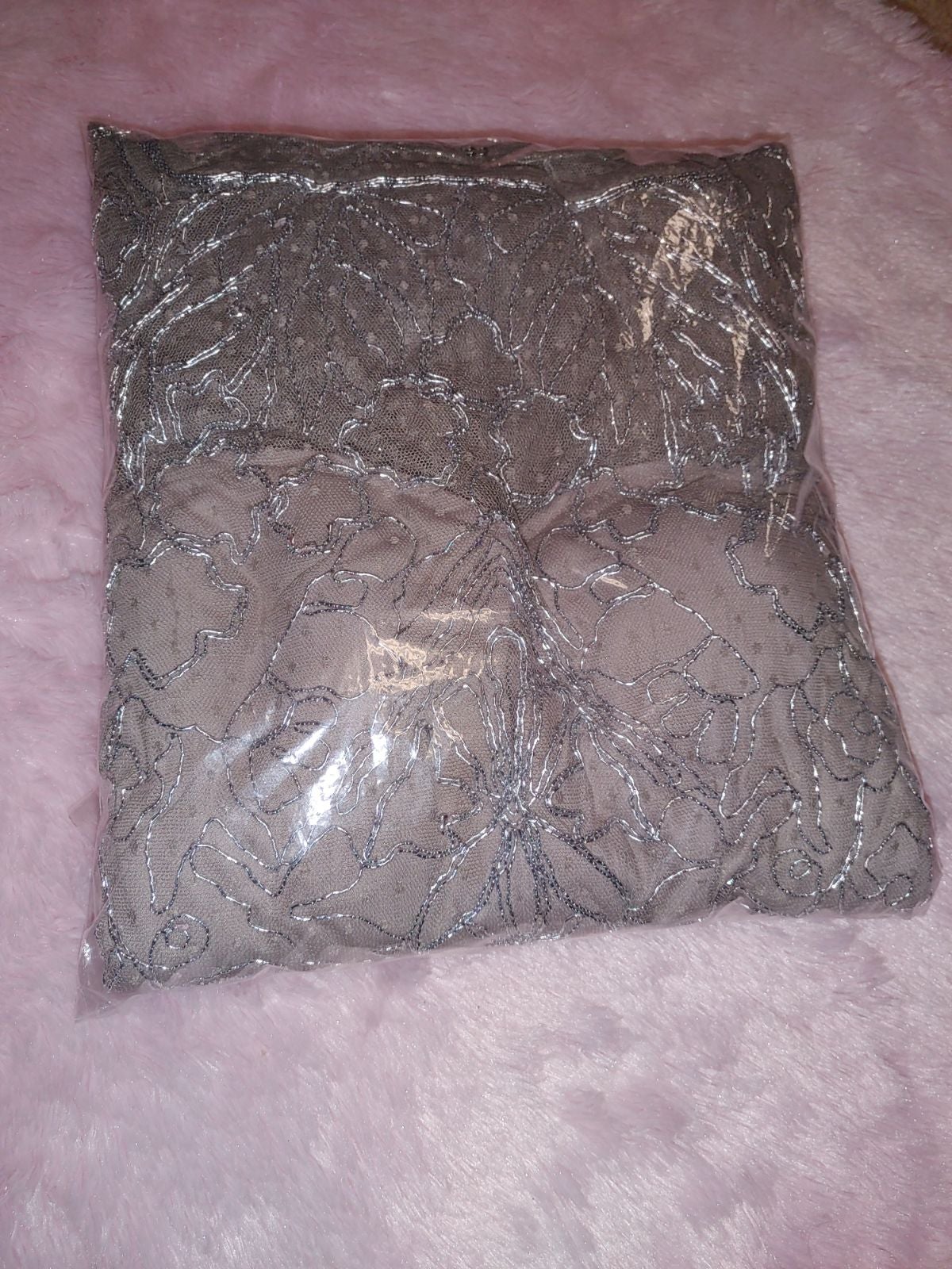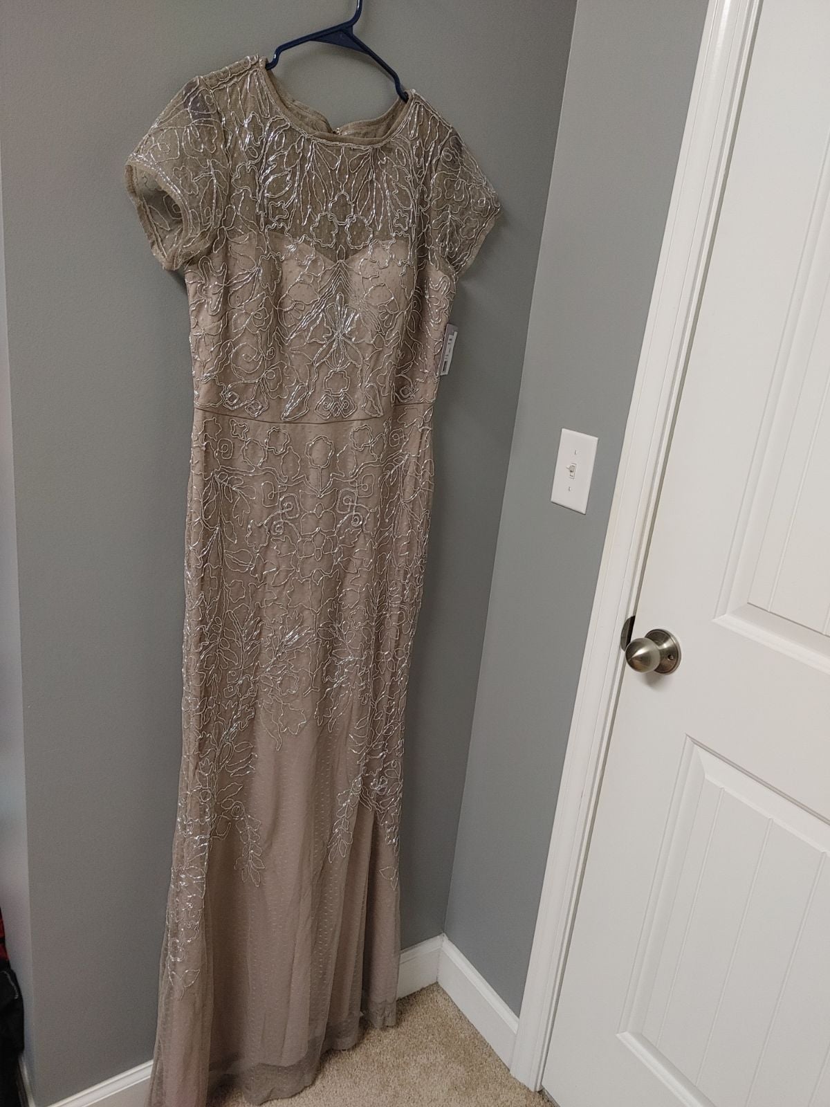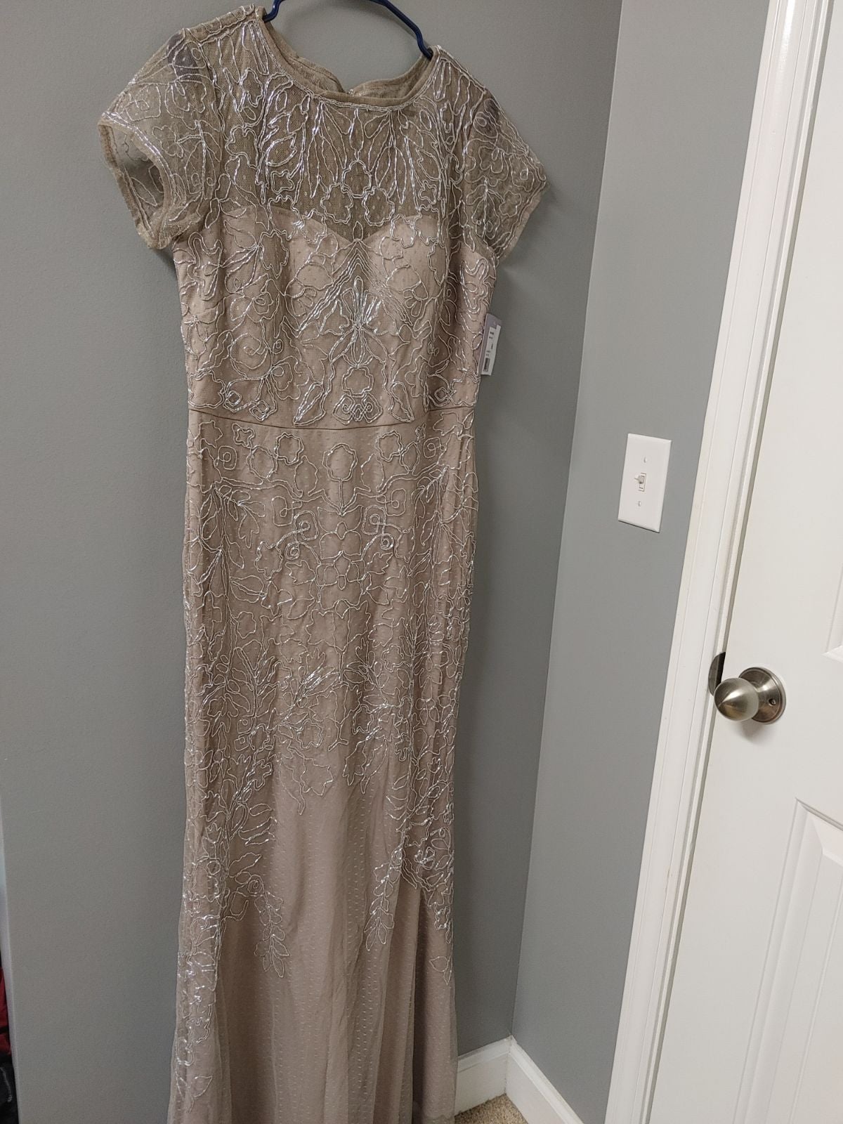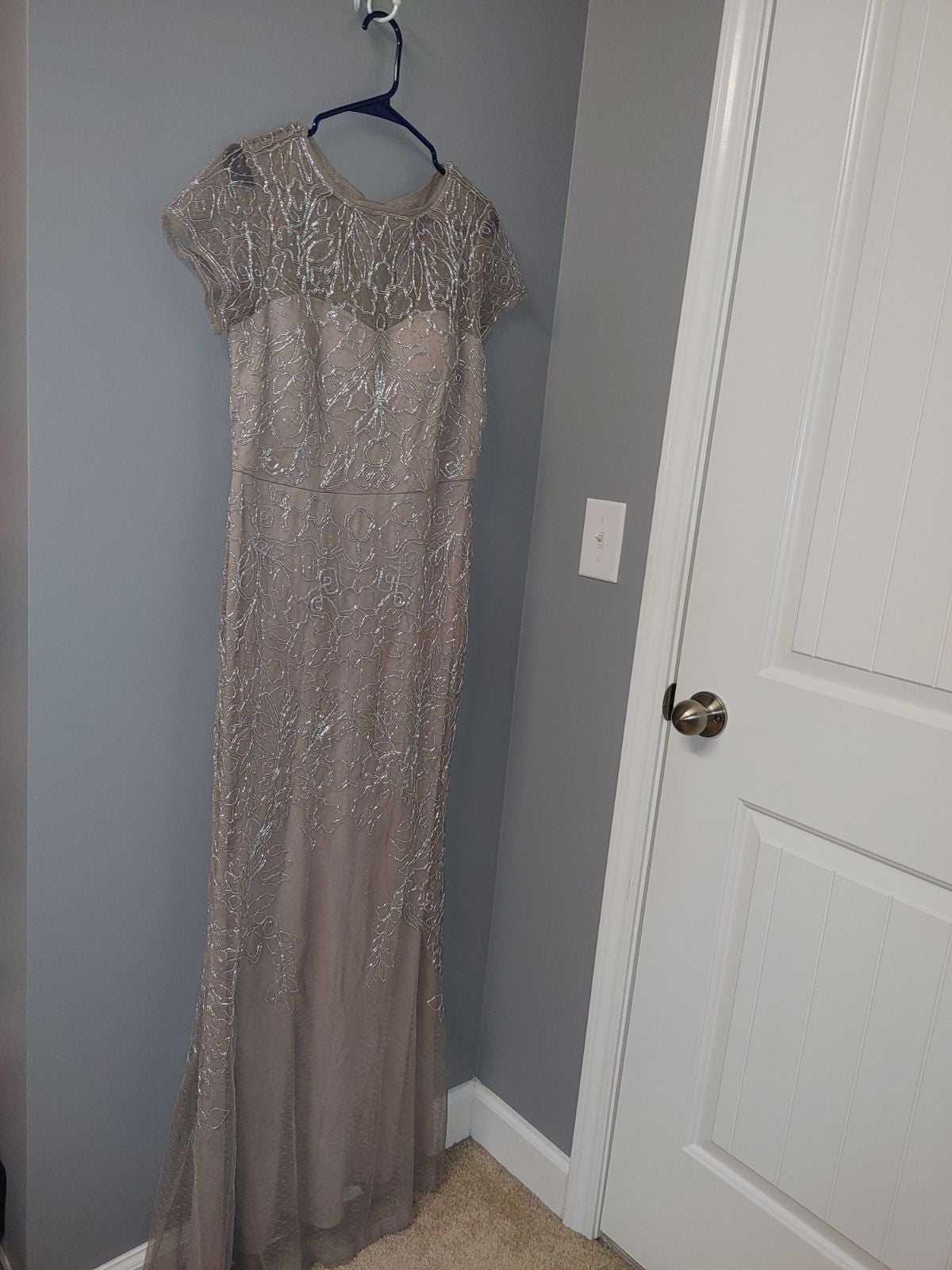 Metallic, embroidered, mesh gown features illusion neckline and short sleeves
