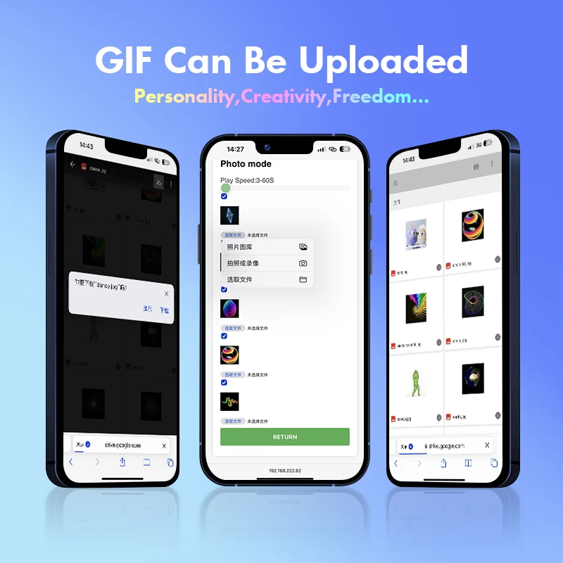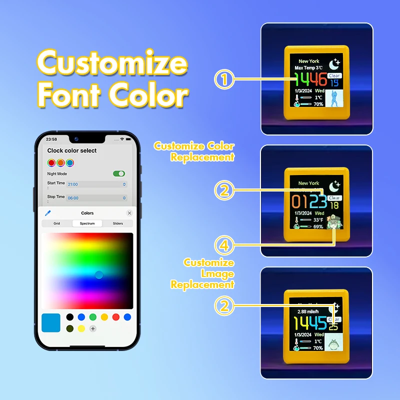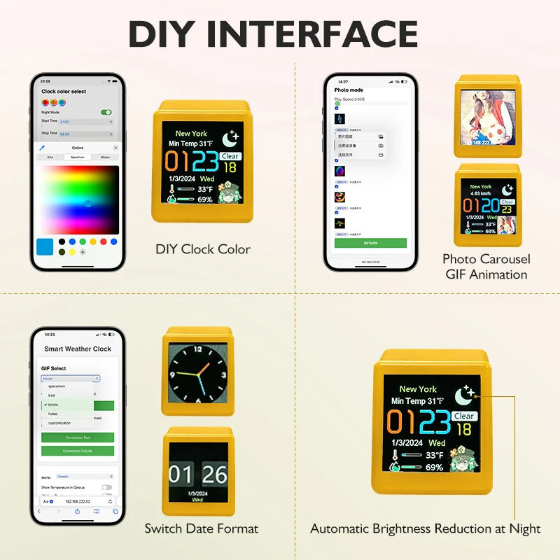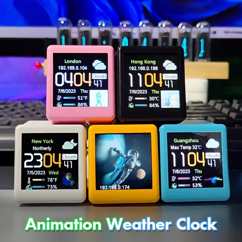 Multi-functions: customisation, display of weather, atmospheric pressure, minimum/maximum temperature, wind speed, city, country/region, day of the week, outdoor temperature and humidity, and gif animation;